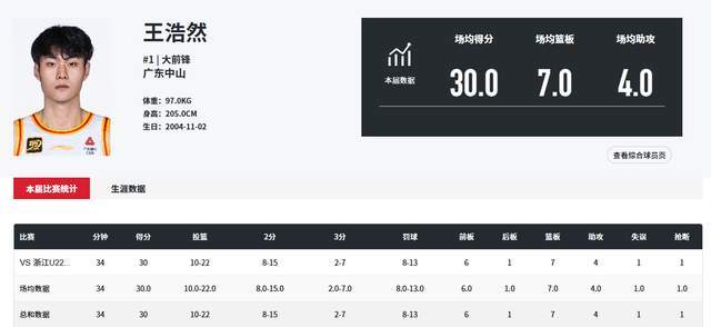 如今全运会开打,广东U22男篮带上了王浩然,小伙子的首秀就十分炸裂,他首发出战34分钟,22投10中,三分球7投2中,13罚8中,独砍全场最高的30分7篮板4助攻,可以说是扛起广东队的那个人了。而广东队从开局就压制对手,最终以92-85胜出。