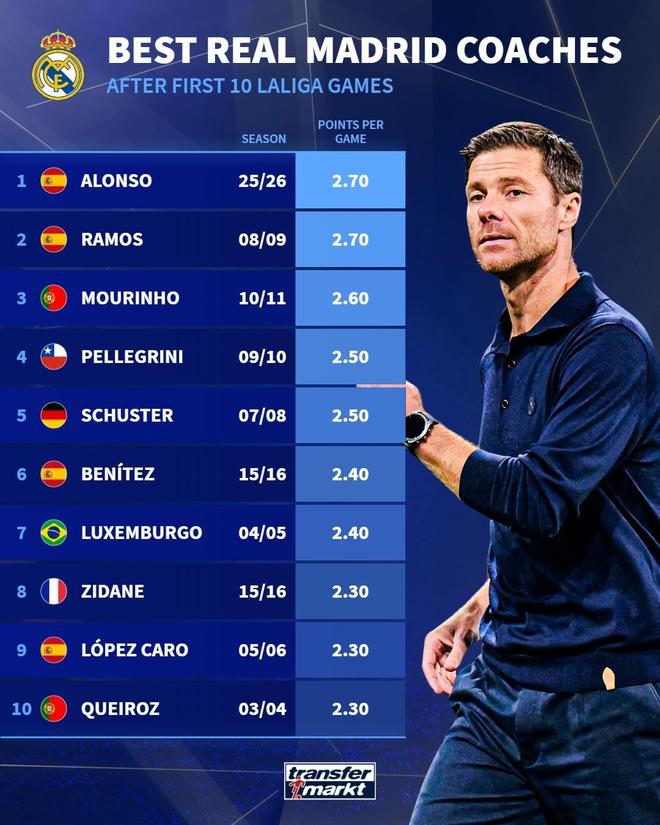 北京时间10月26日,西甲联赛第10轮,皇马在主场2-1战胜巴萨。据统计数据显示,在执教皇马的前10场西甲比赛中,阿隆索场均拿分达2.70分,与胡安德-拉莫斯并列俱乐部历史第一。